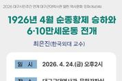 한민일보 서울포커스 김봉순 기자 | 대구문화예술진흥원 박물관운영본부 소속 대구근대역사관은 2026년 대구시민주간 연계행사로 4월 24일 오후 2시에 ‘1926년 4월 순종황제 승하와 6·10만세운동 전개’를 주제로 전문가 특강을 개최한다. 올해 2월 말부터 대구문화예술진흥원 박물관운영본부 소속 대구시립 3개 박물관은 대구시민주간 연계행사로 ‘나라를 지킨 대구, 大邱 정신!’이란 주제로 전문가 특강과 시내 답사, 장거리 답사, 문화공연, 체험학습 등 다채로운 프로그램으로 시민들과 의미 있게 만나고 있다. 대구근대역사관은 ‘대구 독립운동 알기’ 주제 마지막 강연으로, 올해 100주년을 맞는 6․10만세운동을 재조명하는 ‘1926년 4월 순종황제의 승하와 6․10만세운동 전개’를 마련했다. 순종 승하일인 4월 25일에 맞추어 강의 날짜를 정했으며, 강의에서는 순종 장례 전개 과정을 살펴보고 인산일(因山日)에 일어난 6․10만세운동 흐름과 의미를 짚어본다. 특히 대구 독립운동사에서 크게 주목받지 못한 6·10만세운동 전개 과정에서 대구·경북 사람들의 활동에 대해 알 수 있는 좋은 기회가 될 것으로 기