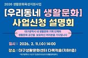 한민일보 서울포커스 김봉순 기자 | 대구문화예술진흥원은 2월 13일부터 3월 6일까지 2026 생활문화육성지원사업 '우리동네 생활문화'에 참여할 생활문화 공간 및 연계 기획단체를 공개 모집한다. ‘우리동네 생활문화’는 지역 내 새로운 생활문화 공간을 발굴하고, 생활문화 기획 프로그램 운영을 통해 커뮤니티 기반 생활문화 공간 조성을 지원하는 사업이다. 올해는 대구 전 지역을 대상으로 신규 생활문화 공간 발굴과 함께 생활문화 활동이 부족한 권역(계층·지역)의 활성화 및 지속 가능한 공동체 육성에 중점을 두고 운영된다. 공모 대상은 대구에 소재한 생활문화 활동이 가능한 공간과 생활문화 기획 역량을 갖춘 단체(문화콘텐츠 관련 예술가·기획자·활동가 등으로 구성된 단체)가 연계된 단체가 대상이다. 올해는 총 10개 내외의 단체를 선정할 예정이며 선정된 단체에는 단체당 550만 원의 사업비 지원과 함께 ‘우리동네 생활문화 지도’ 플랫폼 내 통합 홍보 등을 지원할 예정이다. 공모에 앞서 2월 11일 14시, 대구생활문화센터에서 사업설명회가 진행되며, 사업 신청은 2월 13일부터 3월 6일까지 국가문