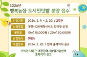 한민일보 서울포커스 김서윤 기자 | 대전시농업기술센터는 도심속 농업․농촌 체험을 통한 도시농업 확산을 위해 2월 9일부터 대전시민을 대상으로 행복농장(도시민텃밭) 참가자 110세대를 모집한다. 행복농장은 농업기술센터(유성구 교촌대정로 97) 내부에 위치하고 있으며, 텃밭은 10㎡구획 65개, 20㎡구획 45개로 구성되어 분양하고 있고, 관수시설 및 쉼터, 농기구함 등 편의시설을 갖추고 있다. 신청방법은 2월 9일 오전 10시부터 2월 20일 오후 5시까지 “대전광역시 OK예약서비스”를 통해 1가구당 1구획을 신청할 수 있다. 신청시 주의사항은 회원정보가 불명확하거나 중복신청 시 추첨에서 제외될 수 있다. 분양자 선정은 무작위 추첨을 통해 이루어지며, 선정 결과는 2월 25일 농업기술센터 홈페이지에 공개하며, 개별 알림톡을 통해 분양료 납부계좌 및 일정을 안내할 예정이다. 최종 분양자 선정이 완료되면 4월 11일 개장식 및 텃밭교육을 시작으로 11월 말까지 자율적으로 운영하게 된다. 이효숙 농업기술센터소장은 “작은 텃밭에서도 큰 행복이 자라듯, 행복농장에서의 소중한 시간이 여