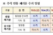 한민일보 서울포커스 김서윤 기자 | 함양군은 민족 최대 명절 추석을 맞아 고향을 찾는 귀성객과 군민들이 쾌적한 환경에서 명절을 보낼 수 있도록 추석 연휴 동안 ‘생활 쓰레기 관리 대책반’을 운영한다. 군은 추석 연휴가 시작되는 10월 3일부터 9일까지 생활폐기물과 음식물 쓰레기 적체를 예방하기 위해 대책반을 편성, 연휴 기간 발생하는 쓰레기 민원과 불법투기 신고에 신속히 대응할 계획이다. 생활 쓰레기 수거 일정은 ▲3일 전 읍면 ▲4일 함양읍·안의면 ▲7일 전 읍면 ▲8일 함양읍·안의면 외 기타 면 ▲9일 전 읍면에서 정상 수거한다. 음식물 쓰레기 수거는 ▲3일 함양읍 ▲4일 함양읍 외 기타 면 ▲7일 전 읍면 ▲8일 전 읍면 ▲9일 함양읍 외 기타 면에서 정상적으로 진행된다. 다만 추석 당일인 6일에는 쓰레기 민원 발생 시 즉시 차량과 인력을 투입할 수 있도록 비상 수거반을 운영해 쾌적한 명절 분위기 조성에 최선을 다할 방침이다. 군 관계자는 “추석 연휴 동안 군민과 귀성객 모두가 쾌적한 환경에서 명절을 보낼 수 있도록 철저히 준비하고 있다”라며 “연휴 기간 발생하는 폐기물은 반드시