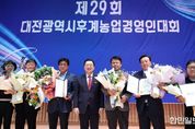 한민일보 서울포커스 김서윤 기자 | 이장우 대전시장이 19일 대전시 농업기술센터에서 열린 제29회 한국후계농업경영인 대전시대회 개회식에서 대전 농업 발전에 기여한 공로로 한국후계농업경영인 대전시연합회로부터 감사패를 받았다. 이번 행사는 ㈔한국후계농업경영인 대전시연합회 주최로 열렸으며, 대전지역 농업인과 농협 관계자, 도시민 등 300여 명이 참석해 농업의 미래를 함께 논의하는 자리가 됐다. 이장우 대전시장은 수상 소감에서 “농업은 국가의 근간 산업으로 식량 안보와 생태계 보전에 중요한 역할을 하고 있다”라며 “과학수도 대전에 걸맞은 첨단기술을 활용해 스마트농업 기반을 조성하고 미래 농업의 성장 동력을 확보하는 데 최선을 다하겠다”라고 말했다.