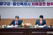 한민일보 서울포커스 김성윤 기자 | 용인특례시는 6일 강원특별자치도 양구군과 자매결연을 하고, 두 도시의 교류와 발전을 위해 적극 협력하기로 했다. 이상일 시장은 이날 양구군청 중회의실에서 서흥원 군수와 두 도시 간 우의를 증진하고 상호 교류‧협력하는 데 합의하고, 자매결연 협약서에 서명했다. 이번 협약으로 양구군은 시의 16번째 자매도시가 됐다. 이상일 시장은 “양구는 문화예술 분야에서 과감한 투자를 하고 있고, 양구군립박수근미술관은 2023년 양구 출신 박수근 화백의 1956년 작품 ‘가족’을 품었는데 두 도시가 앞으로 가족처럼 잘 지냈으면 한다”며 “이번 협약을 계기로 양 도시가 협력을 강화해서 함께 발전하길 기원한다”고 말했다. 이 시장은 “양구군과 용인시의 훌륭한 농산물들이 양 도시에서 소비하도록 서로 홍보하는 등 협조 체계를 갖추는 노력도 기울이자"라며 "양구에는 테니스장, 축구장 등 스포츠 시설이 아주 잘 갖춰져 있는 만큼 용인의 스포츠팀이나 단체들이 양구를 찾아 훈련하는 등 체육 분야의 협력도 도모하면 좋겠다"고 했다. 서흥원 군수는 “용인의 인프라와 비전이 대한민국 지방
