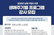 한민일보 서울포커스 김성혜 기자 | 인천시 남동구 구립도서관은 3~12월까지 운영하는 ‘2026년 상·하반기 생애주기별 프로그램’에 함께 할 프로그램 강사를 공개 모집한다고 12일 밝혔다. 올해 구립도서관 4개관(남동논현, 소래, 서창, 만수2동어린이도서관)의 생애주기별 프로그램은 10개 분야로 구성돼 운영될 예정이다. 강사 모집은 유아·아동 대상의 영어·한국사·생태·미술·전래놀이·경제 등 8개 강좌와 성인 대상의 책 놀이·영어독서 지도 교육 등 2개 강좌를 대상으로 한다. 관련 분야 전공자, 교육과정 이수자, 자격증 소지자, 강의 경력자라면 누구나 강사로 지원할 수 있다. 지원자는 강사지원서·강의계획서·자기소개서 등 서류를 준비해 1월 16일까지 남동논현도서관 또는 서창도서관에 방문하거나 이메일을 통해 제출하면 된다. 구는 매년 강사 공개 모집을 통해 여러 분야의 우수한 강사를 발굴·선발하여 생애주기별 프로그램을 진행하며, 지역주민의 교육적 삶의 질 향상과 독서문화 활성화를 통해 지역 내 독서문화 진흥을 도모할 수 있기를 기대하고 있다. 자세한 사항은 남동구립도서관 홈페이
