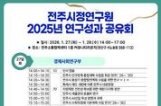 한민일보 서울포커스 김용택 기자 | 전주시정연구원(원장 박미자)은 개원 2주년을 맞아 27, 28일 양일간 전주시 주요 정책 연구성과를 공유하는 ‘2025년 연구성과 공유회’를 개최한다고 26일 밝혔다. 전주시 소통협력센터 1층 커뮤니티 라운지에서 열리는 연구성과 공유회는 전주시 정책 연구 결과를 시민, 관계기관, 전문가들과 공유하고 향후 정책 방향을 논의하기 위해 마련됐다. 첫째 날인 27일에는 경제사회연구부와 문화관광연구부의 연구성과 발표가 진행된다. 경제사회연구부에서는 ▲전주시 인구정책 종합계획 수립 연구(’26~’30) ▲전주시 중장기 종합발전계획 수립을 위한 연구 'Ⅰ' ▲특례시 제도 개편에 따른 전주시 대응방향, ▲지방재정 건전성 확보를 위한 방안 ▲전주시 세출관리 효율화 연구 ▲전주시 AI산업 육성 방향과 과제, ▲전주시 사회적경제 기본계획 수립 연구(‘26~’30)를 발표한다. 이어 문화관광연구부에서는 ▲전주 한옥마을 발전전략 기본구상, ▲전주한옥마을 일원 관광특구 지정을 위한 사전타당성 검토 연구, ▲전주시 정원산업 활성화 방안 연구, ▲전주시 생활 인구 확대 방안 연구, ▲로케이션 인센티브 개선 방안, ▲