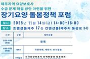 한민일보 서울포커스 김윤희 기자 | 제주특별자치도는 제주지역 요양보호사 인력수급 문제 해결을 위해 오는 11월 14일 오후 2시 호텔샬롬제주 컨벤션홀에서 전문가와 현장 종사자들이 한자리에 모여‘장기요양 돌봄 정책 포럼’을 개최한다고 밝혔다. 이번 포럼은 제주장기요양요원지원센터(센터장 김성건) 주관으로 열리며, 도내 장기요양기관 대표 및 종사자 등 약 120여 명이 참석할 예정이다. 급속한 고령화로 인한 돌봄 인력 부족 문제를 진단하고, 제주지역의 지속 가능한 인력 수급 체계 구축 방안을 모색하기 위해 마련됐다. 포럼은 개회식을 시작으로 주제발표, 종합토론, 질의응답 순으로 진행된다. 첫 번째 주제발표에서는 이희승 박사(국민건강보험공단 건강보험연구원 장기요양정책연구센터 부연구위원)가‘전국 요양보호사 인력 현황과 향후 과제’를 주제로 전국 단위의 인력 현황과 정책적 과제를 짚는다. 이어 김재희 센터장(제주연구원 고령사회연구센터)이‘제주지역 요양보호사 인력 수급 전망 및 정책 과제’를 주제로 발표하며, 제주지역의 현실과 향후 정책 방향을 제시할 예정이다. 이후 진행되는 종합토론에