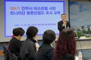한민일보 서울포커스 김은금 기자 | 진주시는 24일 시청 3층 문화강좌실에서 ‘2025년 미소친절 시민모니터단 교육’을 실시해 친절행정 실현에 앞장서고 있다. 이번 교육에는 미소친절 시민모니터단 25명이 참석해 모니터단의 역할과 평가체계를 이해하고, 읍면동 민원현장의 친절서비스 개선을 위한 암행 모니터링 방법 등 실무중심의 교육이 진행됐다. 또한 시민이 만족하는 친절행정 실현을 위한 의견 교환도 활발히 이뤄졌다. 미소친절 시민모니터단의 조사 결과는 올해 상·하반기 2회에 걸쳐 실시한 전화 친절도 평가 점수와 합산해 연말 읍면동 종합평가에 반영될 예정이다. 한편 진주시 미소친절 시민모니터단은 전 읍면동을 대상으로 ▲공무원의 친절도 ▲업무해결 노력도 ▲신속성 및 정확성 등을 시민의 눈높이에서 평가하고, 민원서비스 제도개선 의견을 제시하는 등 공무원 친절역량 강화를 위한 다양한 활동을 펼치고 있다. 장정오 민원여권과장은 “미소친절 시민모니터단은 시민의 눈높이에서 행정서비스를 살피는 소중한 파트너이다”면서 “앞으로도 시민이 체감할 수 있는 친절행정 구현을 위해 모니터단과의 소통을 강화하겠다”