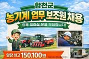 한민일보 서울포커스 김은금 기자 | 합천군은 농기계대여은행 운영체계를 강화하고 농업인 영농 편의를 높이기 위해 2026년 농기계 업무보조원 기간제근로자 9명을 채용한다고 14일 밝혔다. 이번 채용은 기간제근로자의 처우 개선을 통해 안정적인 일자리를 제공하고, 이를 바탕으로 농기계대여은행 이용 농업인들의 영농 편의를 실질적으로 향상시키기 위한 정책의 일환으로 추진된다. 채용 인원은 9명(기술직 8명, 민원응대 1명)이며, 선발된 인원은 농기계대여은행에서 농기계 입·출고 관리, 배송 지원, 임대장비 유지·관리 및 기초 점검, 농기계 순회 안전(수리)교육 지원, 농업인 민원 응대 등 현장 밀착형 업무를 수행하게 된다. 특히 합천군은 업무 숙련도와 전문성을 보수에 반영하는 기술등급별 임금체계를 적용해(99,910원/일~150,100원/일, 복리후생 수당 30만원/월), 농기계 정비수리 실기평가 결과에 따라 차등 지급함으로써 능력과 책임에 상응하는 합리적인 보상체계를 마련했다. 이를 통해 근로자의 근무 안정성과 책임성을 높이고, 서비스 품질 향상으로 이어지는 선순환 구조를 만든다는 방침이다. 채용 대상자