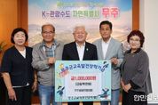 한민일보 서울포커스 박용남 기자 | 무주군은 무주읍발전협의회가 지난 29일 (재)무주군교육발전장학재단에 장학금 1백만 원을 기탁했다고 밝혔다. 김성용 회장은 “오늘 장학금은 무주읍발전협의회 회원들이 ‘제29회 무주반딧불축제 천원 국수 부스’에서 직접 일하며 얻은 수익금 중 일부로, 우리 지역 학생들을 위해 쓰자는 마음을 모아 전달하게 됐다”라며 “앞으로도 무주군 인재 양성은 물론, 지역발전과 이웃 행복을 위한 일에 관심을 가지고 지속적으로 뒷받침해 나갈 것”이라고 밝혔다. 무주읍발전협의회는 18명의 회원들이 참여하고 있는 단체로, 정월대보름 행사를 비롯해 읍민의 날 행사 주관 및 반딧불축제 지원 등 주민 화합과 무주발전을 위한 다양한 활동을 주도해 나가고 있다.