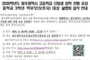 한민일보 서울포커스 박용남 기자 | 광주시교육청은 오는 30일 오후 7시 광주시교육청교육연구정보원 대강당에서 중학교 3학년 학생과 학부모를 대상으로 ‘고입 전형요강 설명회’를 개최한다. 이번 설명회는 고등학교 입학을 앞둔 학생·학부모의 궁금증을 해소하고, 진로·진학 선택에 도움을 주기 위해 마련됐다. 설명회에서는 ▲자율형공립고 ▲과학중점학교 ▲전기고(마이스터고・특성화고・특목고・예술고·체육고 등) ▲후기 일반고 전형요강 등을 안내하고 질의응답을 진행한다. 설명회 참여 신청은 오는 23일까지 온라인'으로 하면 된다. 현장 접수도 가능하며, 행사에 참석하지 못하는 학부모를 위해 시교육청 유튜브 채널을 통해 실시간 중계할 예정이다. 올해 고등학교 원서 접수는 ▲10월 20일 산업수요맞춤형고(마이스터고) 및 광주형마이스터고 ▲10월 21일 광주예술고 ▲11월 3일 광주체육고 ▲11월 24일 특성화고 ▲12월 16일 자율형공립고, 과학중점고를 포함한 평준화 일반고 등 순으로 시작된다. 평준화 일반고 합격자 발표는 2026년 1월 8일이며, 배정 발표는 1월 22일 이뤄진다. 또 학교장