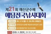 한민일보 서울포커스 임경복 기자 | 예산군은 오는 3월 28일 예당전국낚시대회장에서 ‘제21회 예산군수배 예당전국낚시대회’를 개최한다고 밝혔다. 군에 따르면 예당전국낚시대회는 전국의 낚시 동호인과 관광객이 함께 어우러지는 민물낚시대회로 국민의 레저 수요를 충족하고 지역경제 활성화에도 기여할 것으로 기대된다. 참가 신청은 3월 9일부터 3월 26일까지 선착순 500명을 대상으로 접수한다. 대회 참가를 희망하는 사람은 예당내수면어업계 누리집을 통해 신청할 수 있으며, 참가비는 1인당 5만 원이다. 대회 시상은 1위 트로피와 상금 500만 원, 2위 200만 원, 3위 100만 원이 수여되며, 이와 함께 여자우수상, 최대어상, 외래어종 퇴치상, 최고령상, 원거리상 등 다양한 특별상이 마련된다. 또한 시상 외에도 추첨을 통해 참가자들에게 다양한 경품이 제공될 예정이다. 이 밖에도 참가자 전원에게 중식을 제공하며 광시한우 구이 시식코너 등 다양한 부대행사도 함께 운영할 계획이다. 군 관계자는 “출렁다리와 모노레일, 예당호를 배경으로 한 무빙보트 수상체험 등 다양한 볼거리와 체험거리가
