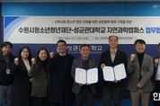 한민일보 서울포커스 진광성 기자 | 수원시청소년청년재단은 11일 성균관대학교 자연과학캠퍼스와 청소년ㆍ청년의 취‧창업 지원과 전인적 성장을 위한 업무협약(MOU)을 체결했다고 밝혔다. 이번 협약을 통해 양 기관은 △대학생 연계사업 활성화를 위한 지속적인 교류활동 추진 및 내실화 △청소년의 진로 탐색을 위한 멘토링 및 학과 탐방 기회 제공 △기타 상호 협력이 필요하다고 인정되는 분야에서의 협조 체계를 구축할 예정이다. 재단 관계자는 "이번 협약이 단순한 형식적 절차에 머무르지 않고 우리 청소년‧청년들에게 새로운 경험과 지속적인 성장의 기회를 제공하는 중요한 출발점이 되기를 희망한다"며, "협약의 성공적인 이행을 위해 상호 긴밀하게 협력해 나갈 것"이라고 밝혔다.