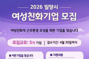 한민일보 서울포커스 김은금 기자 | 경남 밀양시는 여성의 경제활동 참여를 독려하고, 일과 가정이 조화로운 기업 문화를 확산하기 위해 오는 4월 30일까지 ‘2026년 밀양형 여성친화기업’을 모집한다. 경남 도내 최초로 도입된 밀양형 여성친화기업 인증제도는 여성 근로자가 일하기 좋은 환경을 갖춘 기업을 발굴·인증하고, 다양한 행정·재정적 인센티브를 제공함으로써 지역 내 여성 친화적 고용 환경을 조성하는 데 목적이 있다. 신청 대상은 밀양시에 사업장을 두고 있으며, 근로자 5인 이상 기업 중 여성 근로자 비율이 20% 이상인 곳이다. 참여를 희망하는 기업은 4월 30일까지 밀양시 여성가족과로 방문하거나 우편 또는 이메일을 통해 신청서를 제출하면 된다. 시는 접수된 기업을 대상으로 현장 실사를 거쳐 최종 인증 기업을 선정할 계획이다. 인증 기업에는 연차별로 ▲1년 차에는 기업환경개선 지원 ▲2년 차부터는 여성친화 직장문화 조성 지원 등 단계별 인센티브를 지원한다. 이 외에도 ▲여성친화기업 인증패 수여 ▲찾아가는 양성평등 교육 ▲우수기업인 표창 추천 ▲밀양시 기업지원 보조금 사업 가점 부여 등 다양한 혜택