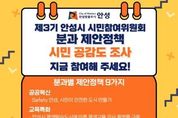 한민일보 서울포커스 임경복 기자 | 안성시는 오는 18일 오후 6시까지 시민참여위원회 분과별 제안 정책에 대한 시민 의견을 수렴한다고 밝혔다. 이번 시민 의견 수렴은 시민참여위원회 정책 발표회를 앞두고 진행하는 사전심사로, 분과별 제안 정책에 대한 시민 공감도를 확인하여 추후 현장심사 결과와 함께 최종 우수 제안 정책을 선정하는 데 활용된다. 7개 분과로 구성된 안성시 시민참여위원회는 소속 위원의 다양한 경험과 지속적인 논의를 바탕으로 안성시 시정에 반영할 정책 연구 활동을 추진해 왔으며, 이달 정책 발표회를 통해 각 분과에서 도출한 정책을 제안하여 그간 활동의 결실을 맺을 예정이다. 정책 발표회를 통해 각 분과에서 제안할 정책 주제는 ▲Safety 안성, 시민이 안전한 도시 만들기(공공혁신분과) ▲안성시 평생학습도시에 따른 평생교육 강사 플랫폼 구축(교육특화분과) ▲안성시 한우산업 탄소중립 모니터링 시스템 구축(미래농업분과) ▲안성시민을 위한 태양광발전 5개년 계획(생태도시분과) ▲전통문화 예술인들을 위한 창작공간 확보(문화도시분과) ▲안성, 사랑 흔들바위 관광지 조성(문화도시분과) ▲더불어 이동하는 자유로운