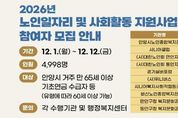 한민일보 서울포커스 김성윤 기자 | 안양시가 1일부터 12일까지 건강하고 활기찬 노후를 위한 ‘2026년 노인일자리 및 사회활동 지원사업’의 참여자 4,998명을 모집한다. 참여자 규모는 유형별로 ▲노인공익활동 3,155명 ▲노인역량활용 1,106명 ▲공동체사업단 574명 ▲취업지원 163명 등이다. 노인일자리사업의 수행기관은 ▲안양시노인종합복지관 ▲비산노인종합복지관 ▲안양시니어클럽 ▲만안·동안노인지회 ▲경기실버포럼 ▲(사)위니버스 ▲시니어복지사회적협동조합 ▲만안구청 ▲동안구청 등 10곳이며, 참여자는 수행기관에서 추진하는 다양한 일자리·사회활동에 참여하게 된다. 신청 자격은 공고일(11월 27일) 기준 안양시에 주민등록이 되어 있는 어르신이다. 세부 기준은 ▲노인공익활동은 65세 이상 기초연금·직역연금 수급자(배우자 포함) ▲노인역량활용은 65세 이상(일부 유형은 60세 이상) ▲공동체사업·취업지원은 60세 이상이다. 다만, 생계급여 수급자(취업지원 제외), 건강보험 직장가입자, 장기요양등급자 등 일부 대상자는 신청이 제한된다. 희망자는 신분증과 주민등록등본 등을 지참하고 해당 수행기