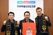 한민일보 서울포커스 곽중희 기자 | 강원특별자치도의회는 2026년 강원FC의 선전과 도내 축구 열기 확산을 위해 ‘시즌권 구매-기부 릴레이’에 동참한다. 강원특별자치도의회 의장 김시성과 김병지 강원FC 대표이사는 1월 14일 도의회 의장 집무실에서 강원FC 시즌권 구매-기부 릴레이를 진행했다. 이번 릴레이를 통해 강원특별자치도의회 명의로 기부된 시즌권은 평소 프로축구를 접하기 어려운 아동과 청소년에게 전달되어 도민 화합과 축구 저변확대에 기여할 것으로 기대된다. 도의회 김시성 의장은 “올 한해도 강원FC가 한 단계 더 도약하고 성장할수 있도록 지속적인 관심을 기울이겠다”며, “강원FC가 도민들에게 화합과 행복을 주는 구단으로 발전하기를 응원한다”고 말했다.