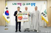 한민일보 서울포커스 임광현 기자 | 중랑구가 지난 6 일 오후 구청장실에서 사단법인 나누며하나되기와 함께 ‘ 취약계층 행복나눔 물품 전달식 ’ 을 진행했다 . 이번 전달식에서 대한불교천태종 산하 사단법인 나누며하나되기는 겨울철 추위와 경제적 어려움을 겪고 있는 지역 내 취약계층과 어린이들을 위해 5,000만 원 상당의 건강·생활·방역용품을 기탁했다. 기탁된 성품은 도움이 필요한 가정에 순차적으로 전달될 예정이다. 사단법인 나누며하나되기는 2003년 창립 이후 국내외에서 다양한 구호 활동을 이어오고 있으며, 중랑구와는 이번이 세 번째 나눔이다. 현재까지 중랑구에 전달한 성품의 누적 가액은 약 1억 원에 이른다. 류경기 중랑구청장은 “지역사회를 위해 꾸준히 따뜻한 나눔을 실천해 주셔서 감사드린다”라며 “기탁받은 성품은 도움이 필요한 이웃들에게 정성껏 전달해 모두가 온기를 느낄 수 있는 겨울이 되도록 하겠다”라고 말했다.