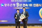 한민일보 서울포커스 임철현 기자 | 광주은행은 16일, 한국능률협회컨설팅(KMAC)이 주관하는‘2026 한국산업의 브랜드파워(K-BPI)’지방은행 부문 9년 연속 1위 선정에 따른 인증식을 개최했다고 밝혔다. 이날 인증식은 광주은행 본점에서 열렸으며, 정일선 광주은행장과 송광호 한국능률협회컨설팅 그룹장을 비롯한 임직원 및 관계자들이 참석해 브랜드 경쟁력 확보 성과를 공유하고, 지속적인 성장 의지를 다지는 시간을 가졌다. ‘한국산업의 브랜드파워(K-BPI)’는 국내 주요 산업을 대상으로 소비자 조사를 실시해 브랜드 인지도와 충성도 등을 종합적으로 평가하는 지표로, 올해로 28년째를 맞은 국내 대표 브랜드 평가 제도다. 광주은행은 이번 평가에서 브랜드 이미지, 이용 가능성, 선호도 등 주요 항목 전반에서 우수한 평가를 받으며, 2018년 이후 9년 연속 지방은행 부문 1위에 오르는 성과를 이어갔다. 이번 인증식은 일회성 성과를 넘어, 지속적인 수상을 통해 광주은행의 브랜드 가치와 고객 신뢰를 다시 한번 대외적으로 인정받았다는 점에서 의미를 더했다. 특히 지역밀착형 금융과 차별화된 영업 전략