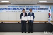 한민일보 서울포커스 유한희 기자 | 제주관광공사와 유엔훈련연구기구(UNITAR) 제주국제연수센터가 국제협력 기반조성 및 상호협력을 위해 손을 잡았다. 제주관광공사는 지난 9일 도내 일원에서 UNITAR 제주국제연수센터(소장 신성철)와 제주의 글로벌 위상 강화 및 지속 가능한 관광 활성화를 위한 업무협약을 체결했다고 10일 밝혔다. 1963년 설립된 UNITAR(유엔훈련연구기구)는 교육훈련과 종합적인 연구를 담당하고 있으며, 전 세계 33개 지역연수센터를 통해 지속가능발전목표(SDGs) 달성을 지원하고 있다. 이들 센터 중 하나인 제주국제연수센터는 지난 2010년 개소 이후 모범적인 연수사업을 운영해오고 있다. 특히 현재까지 아시아·태평양 지역 정부 관계자와 국내·외 청년 등 2만8천여 명에게 세미나·워크숍·온라인 연수 등을 제공, 역량 강화와 지속 가능한 발전에 기여하고 있다. 이날 두 기관은 △국제연수 및 훈련 등의 프로그램 운영 △제주 지역문화 기반의 글로컬 관광 콘텐츠 개발·활용 △국제기구 네트워크를 활용한 제주 글로벌 위상 강화 △유엔 지속가능발전목표(SDGs) 이행 증진 등의 분야에서 공동 협력하기로
