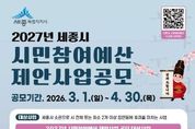 한민일보 서울포커스 김윤이 기자 | 세종특별자치시가 오는 3월 1일부터 4월 30일까지 2027년도 예산편성을 위한 시민참여예산 제안사업 공모를 진행한다. 시민참여예산제는 시민이 예산편성 과정에 직접 참여해 정책 아이디어를 제시하고 이를 실제 정책에 반영하는 사업으로, 재정 운영의 투명성과 책임성을 높이기 위해 운영된다. 공모 분야는 ▲재난·안전 분야 생활안전 사업 ▲교통·환경 등 생활밀착형 개선 사업 ▲지역경제·관광 활성화 사업 등 시민 삶의 질 향상과 편익 증진에 기여할 수 있는 시정 전반에 관한 사업이다. 특히, 다수의 시민에게 혜택이 돌아갈 수 있도록 세종시 전역 또는 2개 이상의 읍면동에 효과가 미칠 수 있는 공익적인 사업이어야 한다. 참여를 희망하는 시민 누구나 세종시 누리집 또는 시민참여예산제 누리집에서 온라인으로 신청할 수 있다. 거주지 인근 읍면동 행정복지센터나 세종시청 5층 예산담당관실로 우편 제출 또는 직접 방문해 제출해도 된다. 접수된 제안은 관련 부서 검토와 시민참여예산위원회 심사, 시민 투표를 거쳐 최종 선정되며, 선정된 사업은 2027년도 본예산에