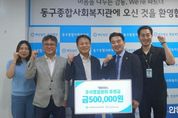 한민일보 서울포커스 임광현 기자 | 부산 동구, 동구종합사회복지관은 근로복지공단 부산지역본부에서 10월 1일 추석 명절을 앞두고, 동구 지역 소외계층에게 힘이 될 수 있도록 50만 원의 후원금을 동구종합사회복지관에 전달했다고 밝혔다. 해당 성금은 동구 지역 내 취약계층의 추석 명절맞이 지원으로 활용될 예정이다. 이외에도 근로복지공단 부산지역본부에서는 임직원들이 매주 수요일마다 복지관 4층 장난감도서관을 방문해 어린아이들이 안전하게 놀 수 있도록 장난감 소독 봉사활동에 꾸준히 참여하고 있다. 민병창 근로복지공단 부산지역본부장은 “어른, 아이 할 것 없이 모두가 행복하고 즐거운 동구가 될 수 있도록 앞으로도 다양한 활동을 통해 사회공헌사업을 이어나가겠다” 고 밝혔다.