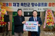 한민일보 서울포커스 김다남 기자 | 옥천군을 향한 출향인들의 뜨거운 고향 사랑이 고향사랑기부 릴레이로 이어지고 있다. 23일 전교식 재경옥천군향수골프회 위원장이 제8회 향수골프회 읍면골프대회에서 100만 원을 기탁했다. 이번 기부는 지난 주 재경청우회 회장, 부회장이 각 100만 원을 기탁한 데 이어 잇따라 이뤄진 것으로 수도권에서 활발하게 활동하고 있는 출향인들의 남다른 고향 사랑이 다시 한번 빛을 발한 것으로 보인다. 기탁의 열기와 함께 진천에서 열린 이번 골프대회는 옥천과 골프를 사랑하는 100여 명의 출향인들이 함께하며 고향사랑기부금 기탁식까지 병행해 더욱 뜻깊은 자리가 됐다. 골프회를 이끌고 있는 전교식 위원장은“고향 옥천에 대한 관심과 애정은 늘 마음 속에 있다”며“작은 정성이지만 옥천의 발전과 주민들의 삶에 도움이 되기를 소망한다”고 소감을 전했다. 이에, 황규철 옥천군수는“옥천을 응원해주시는 출향인들의 따뜻한 마음에 깊이 감사드린다. 기부금은 군민을 위해 의미 있게 사용할 것”이라고 화답했다. 옥천군은 잇따른 출향인들의 릴레이 기부가 고향사랑기부제도에 대한 관심과 참여를