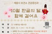 한민일보 서울포커스 곽동근 기자 | 세종특별자치시 보건소가 1일부터 31일까지 한글날을 맞아 ‘10월 한글의 달 함께 걸어요’ 걷기 도전 행사를 운영한다. 이번 행사는 오는 9∼11일 개최하는 세종한글축제와 한글날을 기념하고, 시민들의 건강을 증진하기 위해 마련됐다. 걷기 도전 행사에 참여하려면 세종호수공원 둘레길 50% 이상을 1회 이상 걷고, 10월 중 총 10만 보를 달성하면 된다. 시 보건소는 조건을 충족한 참여자 중 300명을 추첨, 지역화폐 여민전 3,000원을 지급한다. 참여 방법은 본인 명의 휴대전화에 ‘워크온’ 앱을 설치한 뒤 ‘세종시공식커뮤니티’에 가입하고, ‘10월 한글의 달 함께 걸어요’ 걷기 도전을 신청하면 된다. 김수영 보건소장은 “시민들이 걷기 도전을 통해 건강한 생활습관을 실천하고, 한글날과 축제의 의미도 되새기는 계기가 되길 바란다”고 말했다.