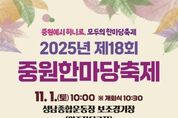 한민일보 서울포커스 김성혜 기자 | ‘제18회 중원한마당축제’가 오는 11월 1일 오전 10시부터 오후 2시 30분까지 2000여 명이 참석한 가운데 성남종합운동장 보조경기장에서 열린다. 성남시 중원구가 후원하고, 중원한마당축제 추진위원회가 주최·주관해 열리는 이번 행사는 ‘중원에서 하나로, 모두의 한마당 축제’를 주제로 진행된다. 이날 특설무대에선 11개 동 주민 대표가 출연해 넘치는 끼와 노래 실력을 선보이는 ‘우리 동네 인기스타’ 공연이 펼쳐진다. 초청 가수 윤수현의 ‘천태만상’ 등 트로트 공연, 신인 아이돌 걸그룹 아스텔의 ‘슈퍼노바’, ‘아일랜드’ 등의 공연, 중원유스센터 청소년 보컬 동아리와 댄스 동아리 공연도 열려 축제 분위기를 달군다. 시민 체험 행사도 다양하다. 행사장 곳곳에 총 11개 체험 부스를 설치해 4차산업과 관련한 드론 축구, 가상현실(VR) 트럭 체험, 배틀 로봇 등과 페이스페인팅, 목공 체험 등을 해볼 수 있다. 중원구 관계자는 “주민 간 화합을 도모하고, 신나고 활기찬 지역 분위기를 조성하는 장이 될 것”이라고 말했다.