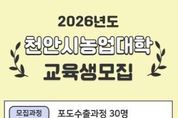 한민일보 서울포커스 황준형 기자 | 천안시농업기술센터는 내달 6일까지 ‘2026년도 천안시농업대학’ 교육생 30명을 모집한다고 23일 밝혔다. 천안시농업대학은 시의 농업을 선도할 신지식 농업인 양성을 목표로 운영되고 있으며, 현재까지 18기 35개 과정을 통해 1,139명의 졸업생을 배출했다. 올해는 포도 수출 확대와 경쟁력 강화를 위해 ‘포도수출 과정’을 개설·운영할 예정이다. 모집 대상은 천안시에 주소를 둔 농업인 또는 농업 종사 예정자로, 입학원서는 센터에 방문하거나 전자우편을 통해 제출하면 된다. 자세한 사항은 센터 교육운영팀으로 문의하면 된다.