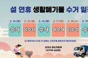 한민일보 서울포커스 임광현 기자 | 순천시는 설 연휴 기간 생활폐기물로 인한 시민 불편을 최소화하고 쾌적한 도시환경을 조성하기 위해 생활폐기물 수집·운반체계를 안정적으로 운영한다고 밝혔다. 설 연휴 기간 종량제 및 재활용, 음식물쓰레기 등 생활폐기물은 14일과 16일에 정상적으로 수거된다. 다만, 설날 당일인 17일 화요일과 18일 수요일은 수거하지 않는다. 수거하지 않는 전날은 배출 자제를 당부했다. 이에 따라 시는 미수거일인 17일과 18일, 생활폐기물 수집·운반 대행업체와 합동으로 기동처리반을 운영해 쓰레기 적체와 관련 민원에 신속히 대응할 방침이다. 한편, 설 연휴를 앞두고 오는 12일, 시 공직자와 환경미화원, 24개 읍면동의 이·통장, 주민자치회, 자원봉사자 등 시민들이 참여하는 설 맞이 합동 대청소를 실시한다. 이번 대청소는 여순로, 매천로 등 4대 관문과 공한지, 이면도로 등 청소 취약지역을 중심으로 진행된다. 시 관계자는 “설 연휴 기간 시민 불편을 최소화하기 위해 생활폐기물 처리에 만전을 기하겠다”며 “생활폐기물은 반드시 수거일 전날 일몰 후에