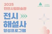 한민일보 서울포커스 황준형 기자 | 천안문화재단은 내달 4일부터 ‘2025 전시해설사 양성프로그램’ 참여자를 선착순 모집한다고 31일 밝혔다. 이번 프로그램에서는 작품과 관람객을 이어주는 전시해설사에 대한 이해와 관련 소양을 기르기 위한 이론과 실무 교육이 진행된다. 교육과정은 ▲한국 현대미술의 흐름과 이해(권영진) ▲도슨트 역할과 이해(김혜정) ▲한국근대미술의 흐름과 이해(권행가) ▲도슨트의 스크립트와 스피치(한이준)으로 구성됐다. 교육은 내달 20일부터 12월 11일까지 매주 목요일 오후 2시~ 4시 30분 천안예술의전당 문화센터에서 진행될 예정이다. 지원자격은 2025 전시해설사 양성프로그램에 참여한 경험이 없는 20세 이상 성인으로, 모집 인원은 총 40명이다. 교육과정 3회 이상 수강 시 수료증이 발급되며, 수료자에게는 내년도 천안시립미술관 문화자원봉사 지원 시 가산점이 부여된다. 자세한 내용은 천안시립미술관 누리집을 통해 확인할 수 있으며, 문의사항은 시각예술팀으로 하면 된다.