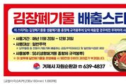 한민일보 서울포커스 김은금 기자 | 거제시는 본격적인 김장철을 맞이하여 일시적으로 다량 배출이 예상되는 김장폐기물의 원활한 배출 및 수거를 위해 김장폐기물 특별수거기간을 운영한다고 밝혔다. 김장폐기물 특별수거기간은 11. 20.부터 12. 31.까지로 42일간 운영되며, 이 기간에 일반주택은 각 가정에서 나온 김장폐기물(배추, 무, 파, 기타 양념류)을 50L 종량제봉투에 담고 김장폐기물 배출스티커를 부착하여 배출하면 된다. 배출 시간과 장소는 기존과 동일하다. 김장폐기물 배출스티커는 특별수거기간에 면·동 주민센터 방문 시 무상으로 제공되며, 시 홈페이지에서 해당 이미지를 출력해서 사용해도 된다. 이는 일반주택에만 한시적으로 허용되며, 공동주택과 일반음식점은 수거 대상에서 제외된다. 또한, 특별수거기간 중 일반 종량제봉투에 김장폐기물을 혼합하여 배출 시 수거되지 않으므로, 시민들은 올바른 배출 방법을 반드시 준수하여야 한다. 김순이 자원순환과장은 “김장철마다 다량의 김장폐기물이 발생하는 만큼, 지정된 배출 방법을 지켜주셔야 원활한 수거가 가능하다”며, “깨끗하고 쾌적한 거리 조성을 위해