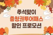 한민일보 서울포커스 임경복 기자 | 충청광역연합(연합장 김영환)은 민족 대명절 추석을 맞아 충청권 대표 관광상품 ‘충청권투어패스’의 특별 할인 프로모션을 진행한다고 밝혔다. 충청권투어패스는 대전·세종·충북·충남 4개 시·도의 주요 관광지를 하나의 패스로 편리하게 즐길 수 있는 통합 이용권이다. 평상시에도 관광지 정상 요금 대비 약 50% 저렴하게 이용할 수 있는 합리적인 관광상품이면서 전체 가맹점 중 이용객이 원하는 관광지를 자유롭게 선택할 수 있는 장점이 있다. 이번 프로모션에서는 충청권투어패스 ‘빅2(2곳 이용권)’ 상품을 정상가 29,900원에서 2만원 할인된 9,900원에 제공한다. 판매 수량은 총 3천 매 한정이며, 9월 26일부터 10월 12일까지 네이버 스마트스토어를 통해 구매할 수 있다. 사용 기한은 10월 31일까지다. 한편, 충청광역연합은 충청권투어패스의 상품 경쟁력 강화를 위해 관광지나 체험시설 뿐 아니라 식음료 업종(카페 등)까지 신규 가맹점 모집을 확대하고 있다. 가맹점으로 등록하면 투어패스 공식 채널 홍보와 주요 온라인 판매망 연계 등 다양한 혜택을 누릴 수 있어 관광객 유입 효과가 기