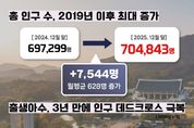 한민일보 서울포커스 황준형 기자 | 천안시는 지난해 5월 총인구 70만 명을 돌파한 이후 증가세를 이어가며 2019년 이후 최대 인구 증가 기록을 경신했다고 15일 밝혔다. 지난해 12월 말 기준 천안시 총인구(외국인 포함)는 지난해 같은 기간보다 7,544명(1.1%) 늘어난 70만 4,843명으로 집계됐다. 이는 2019년 이후 연간 증가치 중 최대 증가한 수치로 분석된다. 천안시 총인구는 지난해 5월 70만 403명을 기록한 이후 7월(785명), 9월(1,088명), 10월(666명) 등 매월 꾸준한 증가세를 보였다. 특히 9월에는 한 달 사이 1,000명 이상이 늘어나며 증가세가 가장 두드러졌다. 인구 통계적 지표 개선도 눈에 띈다. 지난해 출생아 수(3,711명)가 사망자 수(3,591명)를 앞지르며 3년 만에 ‘인구 데드크로스’를 극복했다. 천안시는 출산 친화적 사회분위기 확산을 위해 ▲7남매 다둥이 맘인 김소정 씨 출산장려 홍보대사 위촉 ▲출산장려 릴레이 캠페인 전개 ▲초중고 및 읍면동 찾아가는 인구교육 확대 운영 등 시민 인식제고 활동도 함께 추진해 정책효과를 높였다.