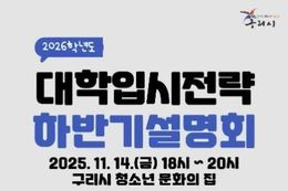 한민일보 서울포커스 김정옥 기자 | 구리시는 ‘2026학년도 대학입시 전략 하반기 설명회’ 참석자를 오는 10월 17일부터 구리시 통합예약 포털을 통해 선착순 110명까지 신청받는다고 밝혔다. 이번 설명회는 오는 11월 구리시청소년문화의집에서 열리며, 지역 학생과 학부모를 대상으로 변화하는 입시제도에 대한 이해를 돕고, 맞춤형 진학 전략을 안내하기 위해 마련됐다. 이번 하반기 설명회는 아래와 같이 총 3회에 걸쳐 진행된다. ○ 11월 14일 : '2029학년도 대입전형 및 입시 전략' (윤윤구 강사) ○ 11월 19일 : '2027학년도 대입전형의 이해와 대비' (조만기 강사) ○ 11월 21일 : '2027학년도 대입전형의 이해 및 효율적 지원전략' (김성길 강사) 참석 대상은 관내 중학교 3학년 및 고등학교 1‧2학년 학생과 학부모이며, 강의는 약 2시간 동안 진행된다. 설명회 후에는 참석자들의 궁금증을 해소하는 질의응답 시간도 마련될 예정이다. 백경현 구리시장은 “구리시는 2021년부터 매년 대학입시 전략 설명회를 운영하며, 자녀들의 진로 준비를 돕기 위해 힘써왔다”라며, “이번 설명회가 변화하는 입시제도를 이해하고, 우리 아이들의 미래를 위한 전략을