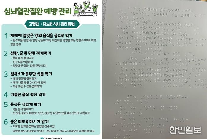 해당 자료는 고혈압‧당뇨병 환자를 위한 식생활 실천 가이드를 중심으로 구성됐다. 식품 선택법, 영양표시 이해법, 건강 식단 구성 등 실질적인 정보를 전문 점자 인쇄 방식으로 제공해 시각장애인의 이해도를 높이고 일상 속 건강관리를 유도한다.