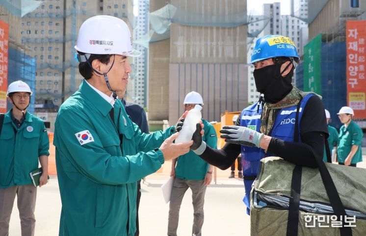 한민일보 서울포커스 곽중희 기자 | 장마가 끝나고 폭염이 본격화된 가운데 김진태 강원특별자치도지사는 7월 23일오전 10시 춘천 삼천동의 아파트 건설 현장을 방문해 폭염 대응 실태를 점검하고, 근로자들의 건강과 안전관리에 각별한 주의를 당부했다.