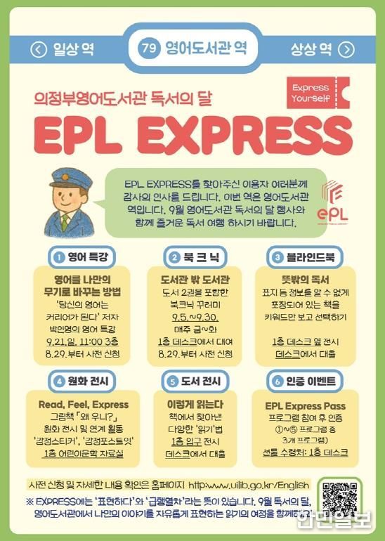 한민일보 서울포커스 심기옥 기자 | 의정부영어도서관은 9월 ‘독서의 달’을 맞아 ‘EPL Express: Express yourself’를 주제로, 시민들이 다양한 방식으로 읽고 표현하며 독서 경험을 확장할 수 있는 독서문화 행사를 운영한다.
