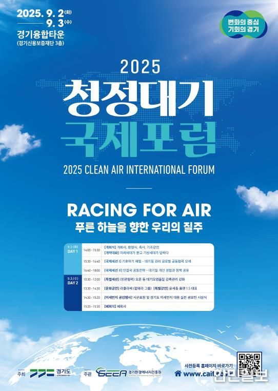 한민일보 서울포커스 김윤이 기자 | 경기도가 9월 2일부터 3일까지 이틀간 광교 경기융합타운(경기신용보증재단 3층)에서 ‘2025 청정대기 국제포럼’을 개최한다. 이 행사는 유엔이 공식 지정한 ‘푸른 하늘의 날’을 맞아 마련됐으며, 동아시아 지방정부, 국제기구, 국내외 환경 전문가와 기업, 학계, 도민 등 약 120명이 참석한다.
