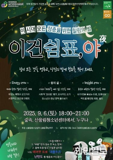 한민일보 서울포커스 김윤이 기자 | 부천여성청소년재단이 운영하는 산울림청소년센터는 오는 9월 6일 저녁 6시부터, 경쟁과 성과 압박에 지친 청소년, 청년 등 시민들을 위한 힐링 문화 축제 ‘힐링의 밤-'이건 쉼표, 야(夜)'’를 개최한다고 밝혔다.