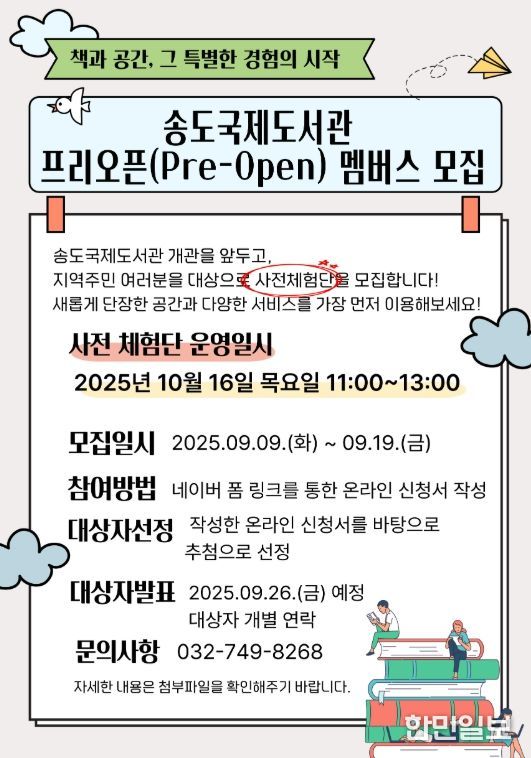 한민일보 서울포커스 백진욱 기자 | 연수구는 오는 10월 개관을 앞둔 송도국제도서관의 ‘프리오픈 멤버스(사전체험단)’을 모집한다.
