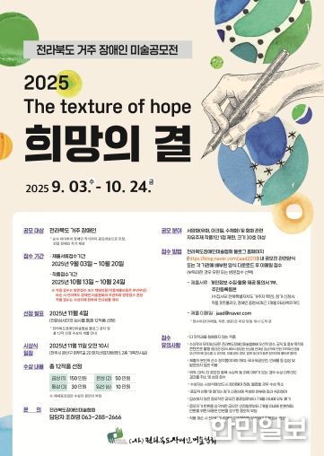 한민일보 서울포커스 김윤희 기자 | 전북특별자치도가 (사)전라북도장애인미술협회(회장 정성수)와 함께 장애인들의 예술적 재능 발휘와 사회적 소통을 위한 ‘2025 희망의 결’ 장애인 미술 공모전을 개최한다.