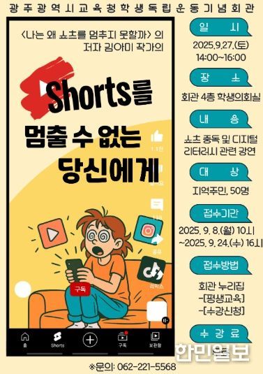 강연은 ‘나는 왜 쇼츠를 멈추지 못할까’의 저자 김아미 작가가 맡는다. 김 작가는 ‘쇼츠를 멈출 수 없는 당신에게’를 주제로 ▲디지털 미디어 리터러시의 기본 개념과 필요성 ▲알파 세대 청소년이 경험하는 쇼츠·SNS·AI 환경 ▲청소년의 건강한 성장을 위해 성인이 해야 할 역할 등을 소개한다.