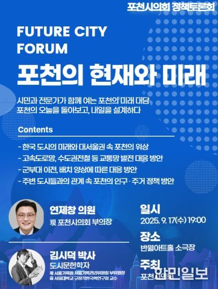 이번 토론회는 급변하는 수도권 환경 속에서 포천의 현안을 짚어보고 미래 발전 방향을 모색하기 위해 마련된 자리로, 포천 시민과 전문가, 의회가 함께하는 열린 논의의 장이 될 예정이다.