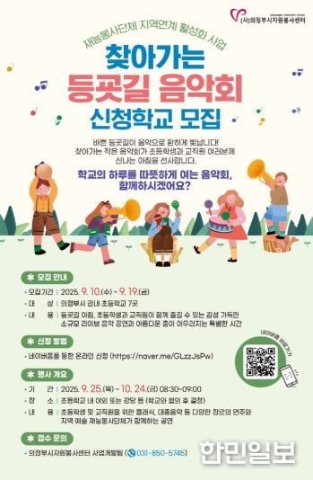 한민일보 서울포커스 심기옥 기자 | 의정부시자원봉사센터는 지역 내 초등학생과 교직원의 정서 함양 및 문화 향유 기회 확대를 위해 '찾아가는 등굣길 음악회'를 오는 9월 29일부터 10월 24일까지 관내 초등학교 7곳에서 운영할 예정이며, 이에 따른 참여 학교를 9월 19일까지 모집한다.
