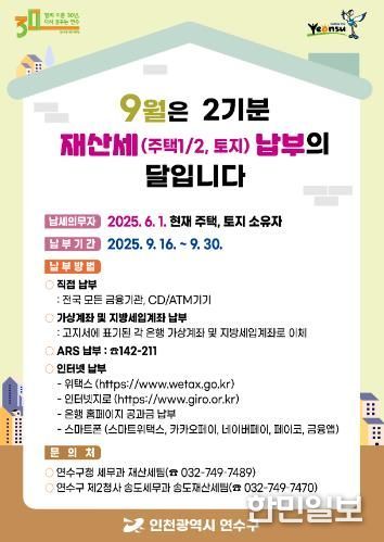 연수구 관계자는 “재산세는 연수구의 복지와 지역 발전을 위한 소중한 재원”이라며 “기한이 지나면 납부지연가산세를 추가로 내야 하는 불이익이 있으니 기한 내 납부해 주시길 바랍니다.”라고 말했다.