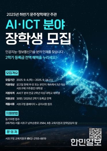 장학생 신청 자격은 부, 모 또는 본인이 모집 공고일 기준 1년 이상 서초구에 거주 중인 2학년 이상 대학생으로, AI·ICT 관련 학과 학생이면 누구나 신청이 가능하다. 구는 학업 성적과 소득 수준 등을 기준으로 심사해 최종 선발 대상자를 10월 내 확정한다는 방침이다.