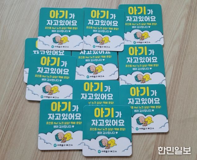 한민일보 서울포커스 백진욱 기자 | 인천 미추홀구보건소는 출산 가정이 휴식과 안전에 대한 배려를 받을 수 있도록 ‘아기가 자고 있어요’ 현관 자석 스티커를 제작해 무료로 배부한다고 17일 밝혔다.