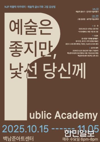 한민일보 서울포커스 김윤이 기자 | 경기문화재단 백남준아트센터가 오는 10월 15일부터 11월 5일까지 매주 수요일 저녁, 성인 대상 프로그램 ‘NJP+ 퍼블릭 아카데미: 예술적 글쓰기와 그림 감상법’을 운영한다. 이번 아카데미는 예술은 좋지만 다소 낯설게 느껴졌던 성인들에게, 작품과 친밀하게 소통하고 자기만의 언어로 표현하는 방법을 제시하는 실습과 강의가 접목된 과정이다.