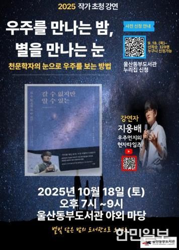 한민일보 서울포커스 임경복 기자 | 울산 동부도서관은 오는 10월 18일 오후 7시 야외 잔디마당에서 천문학자이자 유튜브 1인 방송 진행자(크리에이터) 지웅배 작가의 초청 강연 ‘우주를 만나는 밤, 별을 만나는 눈’을 연다.