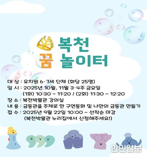 한민일보 서울포커스 임광현 기자 | 복천박물관은 유치원·어린이집 등 6~7세 유아 단체 대상 교육프로그램 '복천 꿈 놀이터'를 오는 10월부터 새롭게 선보인다고 밝혔다.